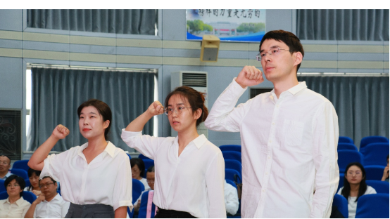 三名新入职教师高举右拳、庄严宣誓。铿锵有力的誓言,是新教师对教育事业的赤诚承诺,期待年轻的老师们扎根EMC易倍官方网站、扎根emc易倍,书写属于自己的教育篇章。