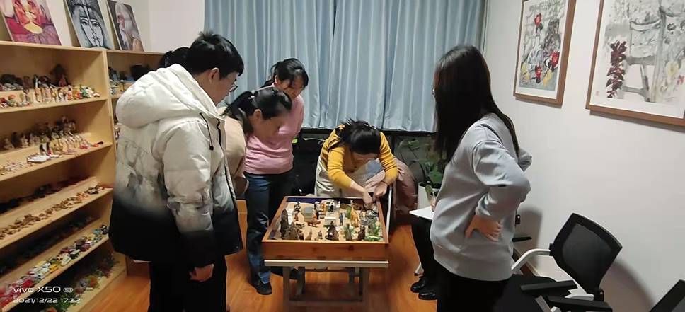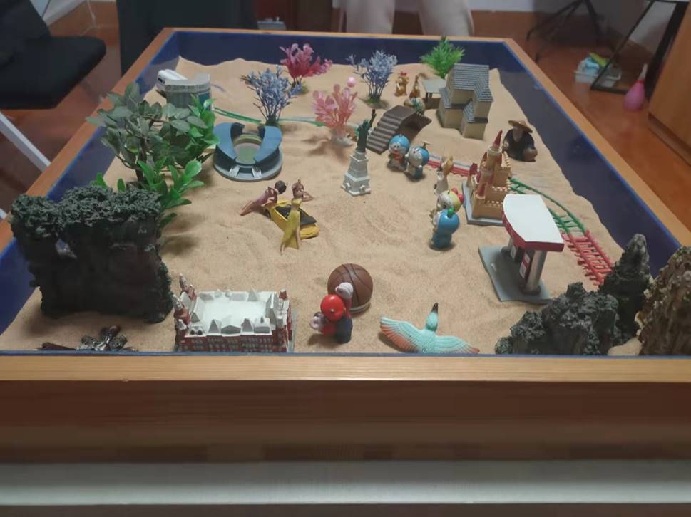 活动分两组进行。活动中,任老师介绍了沙盘理论和团体沙盘规则,小组成员通过抽签的方式确定顺序,然后依次完成沙件摆放或移动。整个过程中,成员之间全程保持安静,不用任何言语或非言语的交流,感受团体动力,创造心灵家园。在全体成员的共同努力下,原本荒芜的沙盘逐渐变得生机勃勃,最终变成一幅现代社会与原始自然和谐共存的风景画。接着,大家分享了自己每次操作的动机与情绪体验,加深彼此之间的了解。一沙一世界,一物一心田。心理沙盘就像是老师们内心世界的镜像,在摆放沙具的过程中,释放着自己,表达着自己,感受到沙盘游戏对心灵的滋养。