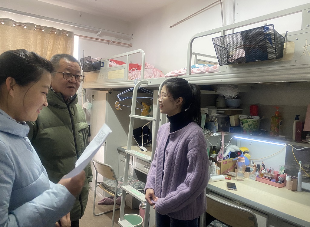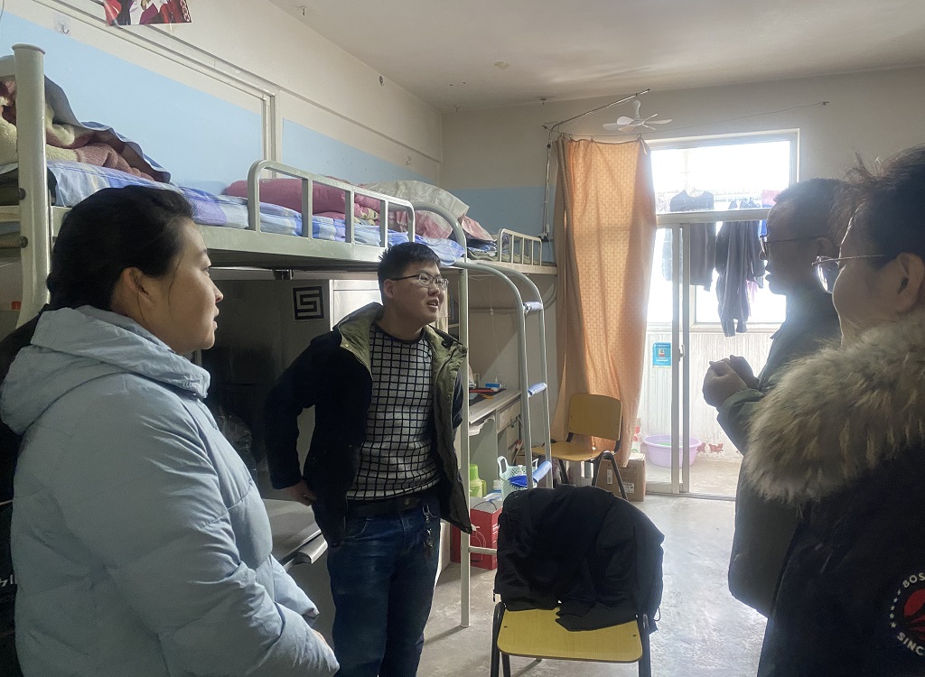 2022年1月26日上午,公司党委书记张忠璞、党委副书记郑芳、学工办主任白小芳以及辅导员郭洋、路晨鹤走入员工公寓,看望慰问寒假留校员工。