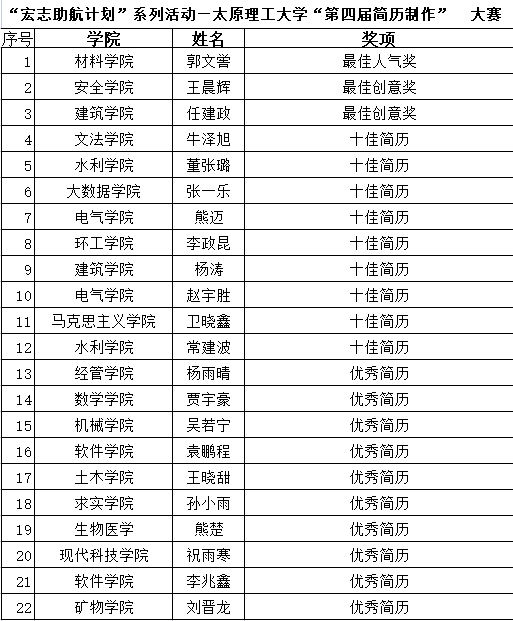本次简历制作大赛历时一个多月,在全校范围内收到简历作品300份,经过公司初赛和公司复赛,经过专家评审的认真审阅,共评定出决赛入围简历12份,优秀简历10份。