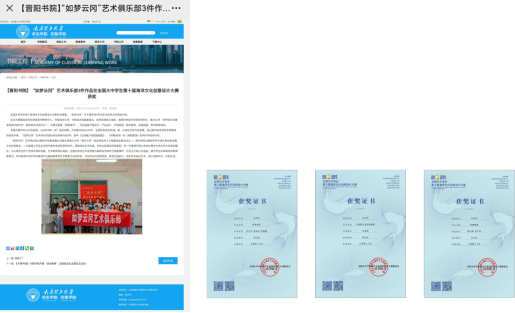 3、2021年全国大中员工第十届海洋文化创意设计大赛“如梦云冈”艺术俱乐部组织参加初审作品9件,其中《记海错沙鱼国画插图》、《经略海洋》和《海错图谱》获得大学组佳作奖;2021年俱乐部成员组队参加三创赛,获校赛二等奖;2022年在EMC易倍官方网站大学百廿校庆之际,俱乐部成员分两个不同方向创作团队,在两个月时间里,深挖校园文化,创作14余件作品,并开发明信片等相关衍生品。2022年山西平面设计奖,俱乐部入围20余件作品,2件获优秀奖……