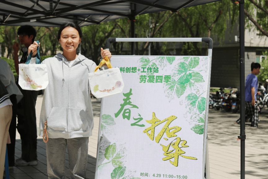 现场活动氛围热烈,参加活动的师生们选择了适合拓染的植物,经清洗、构图、敲拓等工序,将自然之美定格于帆布包。曾参与图书馆志愿服务的武奇宇同学感叹:“上千次敲击才能让色素均匀渗透,这比数据录入更需要专注力。”曾多次参与校园实践勤工助学岗位的杨晓婷同学表示“原来劳动不仅是体力付出,更是创造美的过程。”公司资助负责人李敏宜老师在活动现场表示:“要让同学们在劳动中既锤炼‘造物’的技艺,也培养‘造美’的素养。”